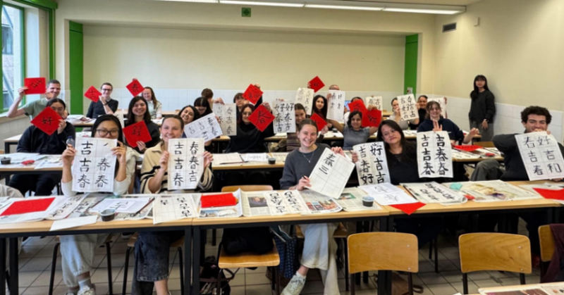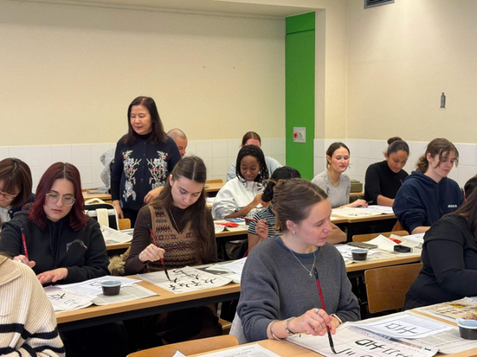 The Taipei Representative Office in the EU and Belgium has been collaborating with KU Leuven for many years assisting it to offer Chinese language courses at its Brussels campus. They continue to explore innovative ways to attract students and enrich their language learning experience, and encourage more engagement with Taiwan. To enhance students’ understanding of East Asian culture and Taiwan’s education landscape, the Education Division and KU Leuven organized a Chinese calligraphy workshop held on February 12, 2026, as part of a Multilingual and Cultural Week series of events to celebrate the university's 600th anniversary.